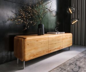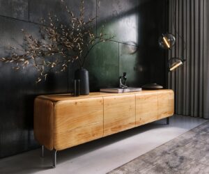 Buffet Tereos 200 cm chêne naturel effet 3D 4 portes patins en acier inoxydable brossé