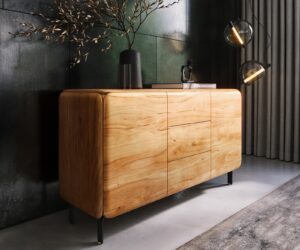 Buffet Shavani 145 cm, acacia naturel, 2 portes, 3 tiroirs, pieds arrondis en acier inoxydable argenté