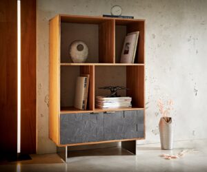 Étagère Teele 90×130 cm acacia naturel ardoise 2 portes pied flottant inoxydable