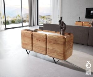 Meuble-bas Kiano 220 cm Acacia Nature 4 Portes Pied en V Acier inoxydable Séparateur de pièce