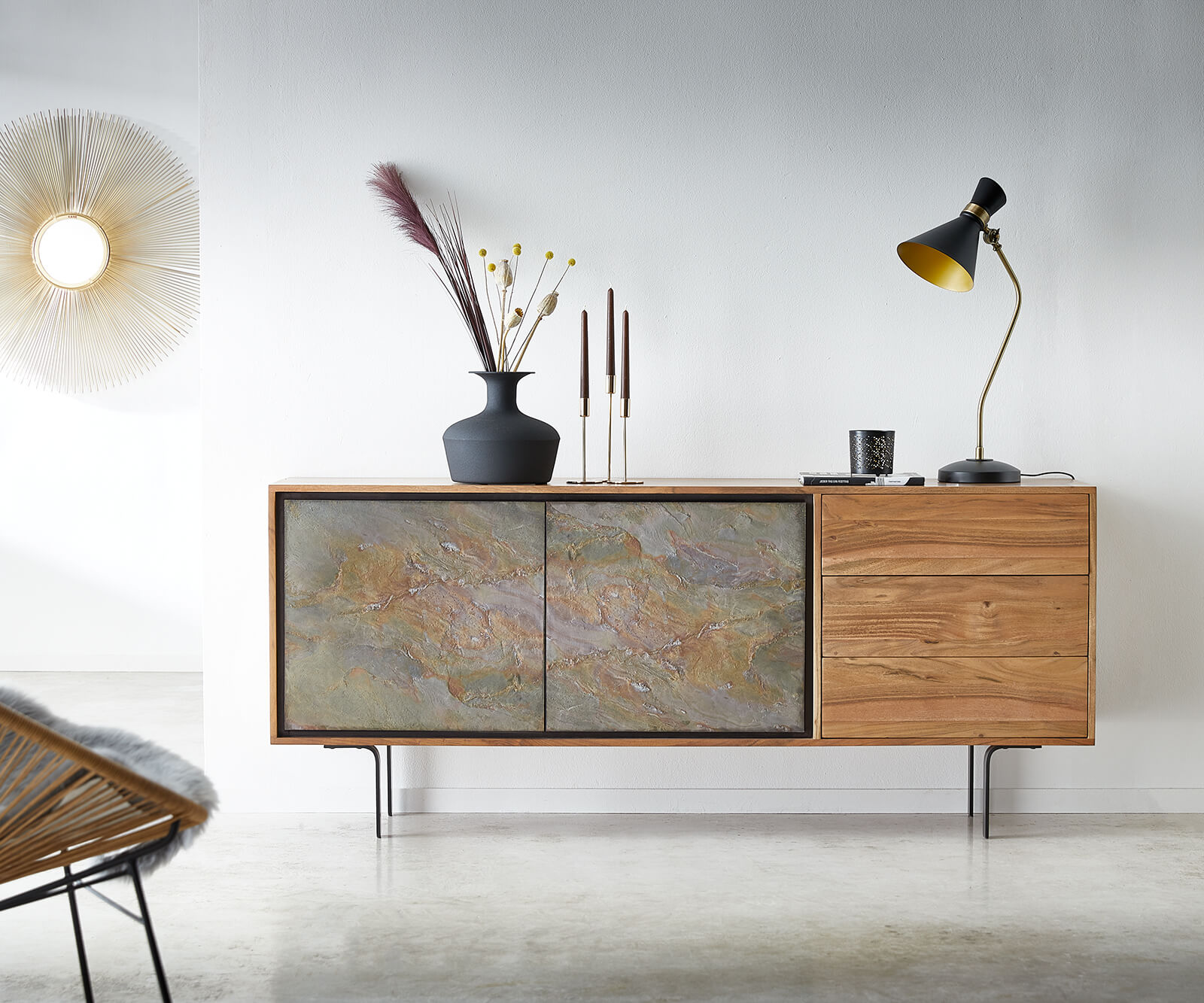 Commode Juwelo 175 cm acacia naturel avec placage de pierre