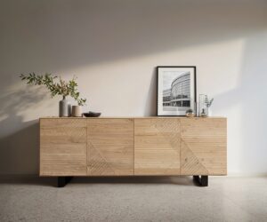 Buffet Tereos 200 cm chêne naturel effet 3D 4 portes piètement traîneau métal noir