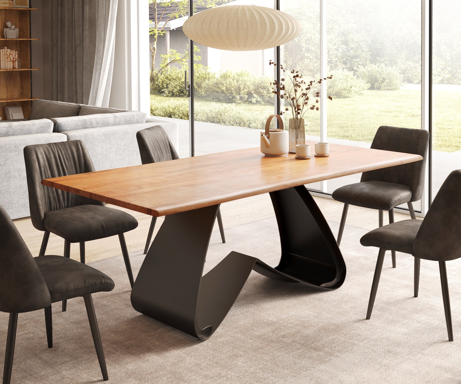 Table à manger Edge Boot 200×100 acacia nature cadre en V acier plat noir bord suisse