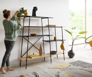 Bibliothèque Mikkusu 185x160cm bambou naturel manguier noir 5 étagères métal noir